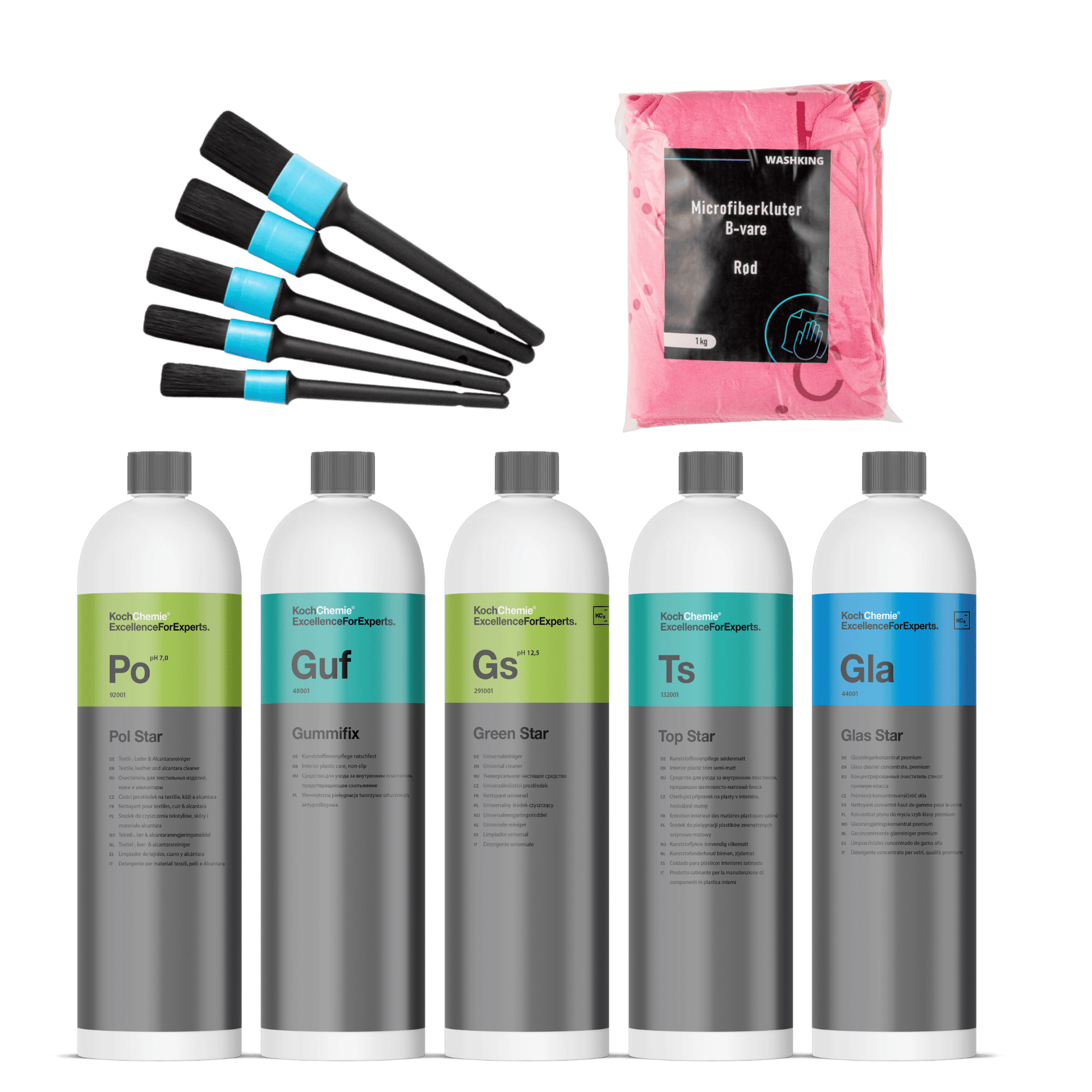 Green Star er en kraftig all-purpose cleaner (APC) som brukes på dørpaneler, plast og matter, mens Pol Star er mildere og spesielt godt egnet til tekstil og skinn. GUF (Gummi-Fix) gir en naturlig finish og beskyttelse på gummilister og pedaler. Med detailerbørster, mikrofiberkluter og hansker får du full kontroll på prosessen – trygt og effektivt.