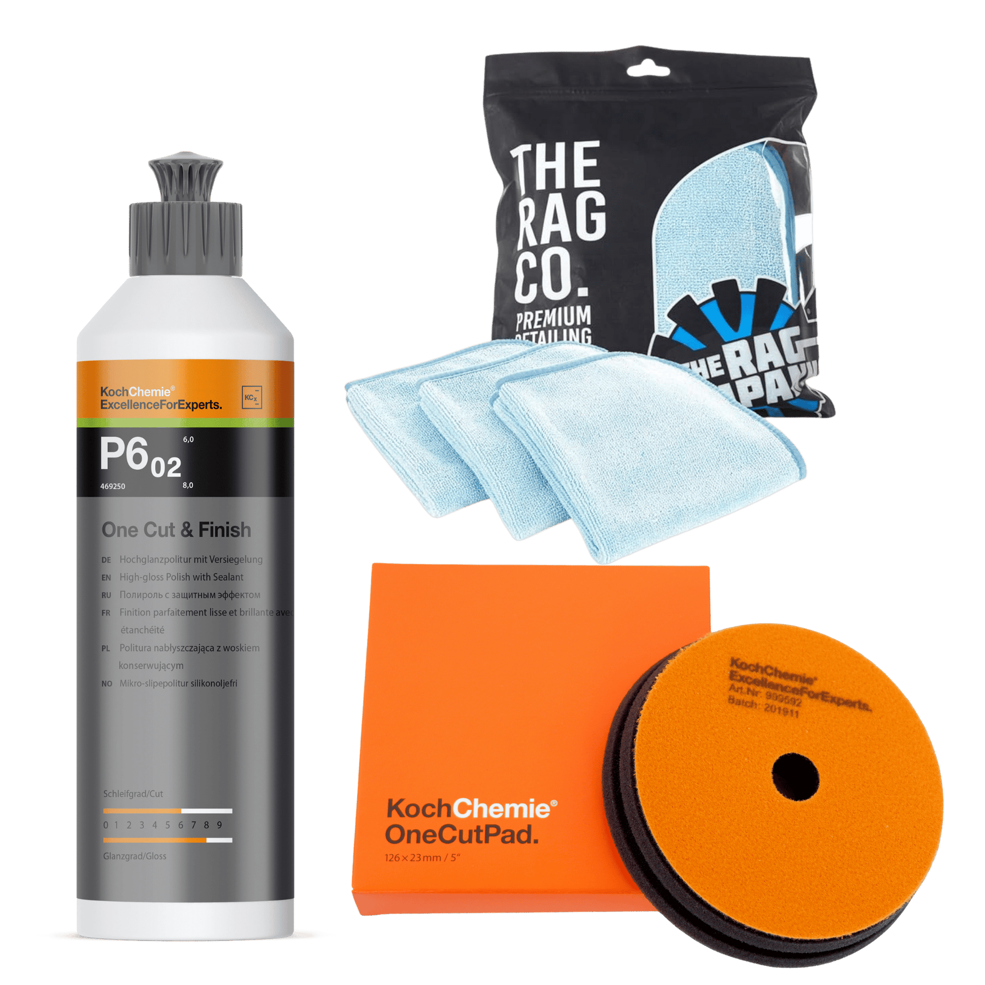 Med Koch Chemie P6.02 One Cut & Finish får du både korrigering og glans i ett produkt, kombinert med kvalitetsputer og mikrofiberkluter for perfekt resultat.