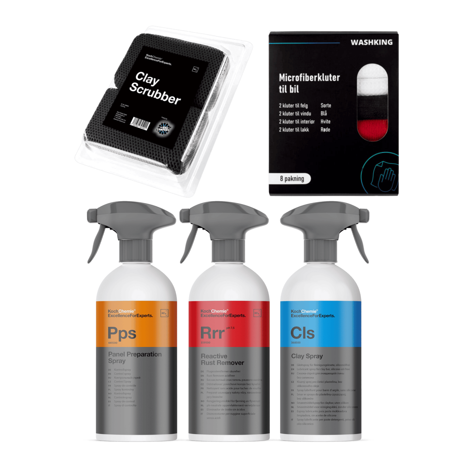 Start med Reactive Rust Remover for å fjerne metallpartikler. Bruk deretter Clay Spray sammen med Clay Scrubber for å fjerne overflateforurensning. Avslutt med Panel Prep Spray for å fjerne oljer og rester før du legger beskyttelse. Tørk alltid over med rene mikrofiberkluter fra WashKing-boksen.