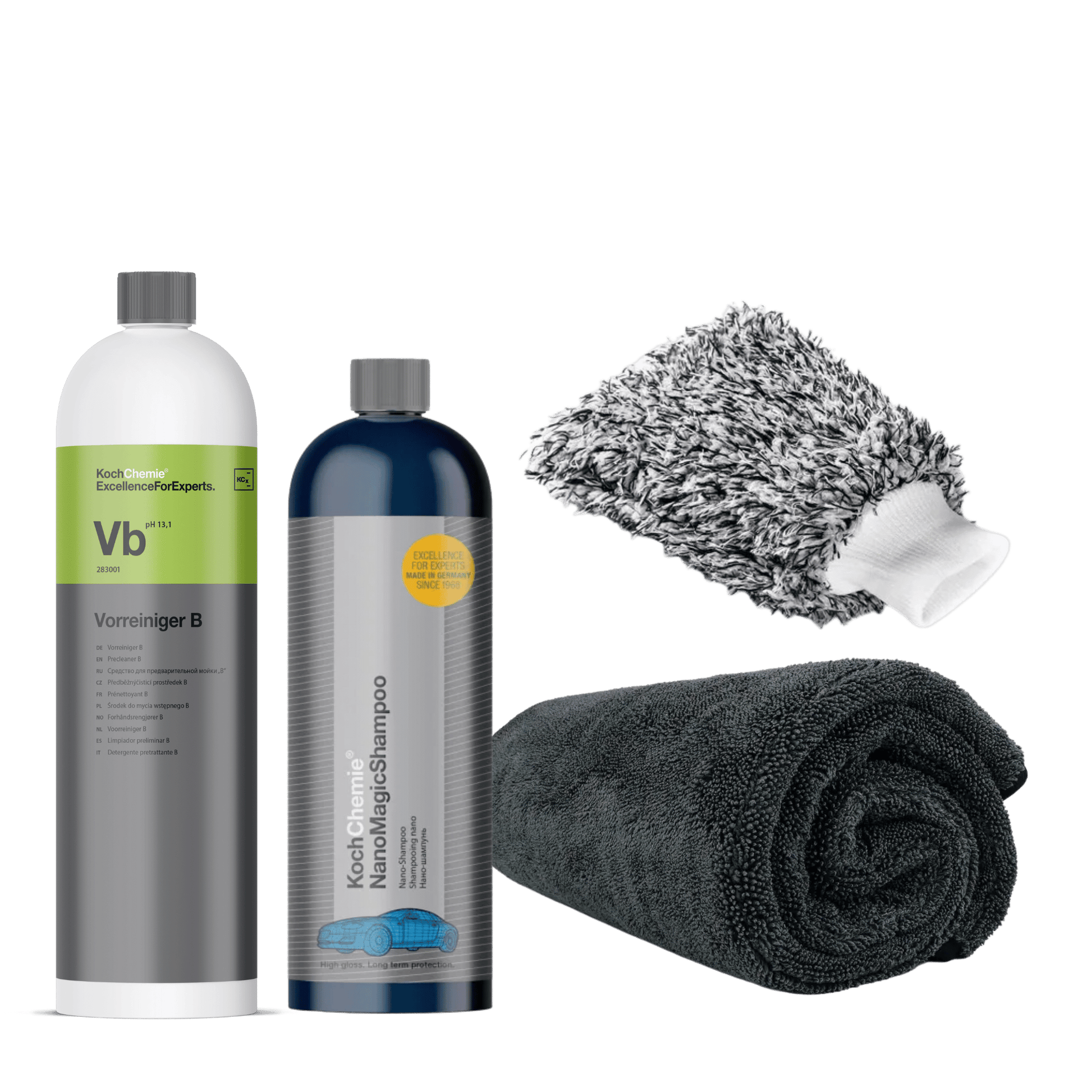 Start med Vorreiniger B som forvask på kald bil for å løse opp salt og grovt smuss. Skyll grundig. Vask deretter bilen med Nano Magic Shampoo og SBP vaskehanske. Avslutt med tørk using mikrofiber tørkehåndkle for å unngå vannmerker og sikre en ren, blank overflate.